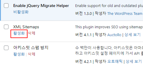 설치가 다 되었으면 설치한 플러그인으로 가 본다 클릭을 하면 나의 워드프레스에 설치를 한 플러그인이 보인다 아직까지 세팅 중이라 플러그인도 많지 않고 아직 글도 하나도 없는 그런 웹사이트 이다 앞으로 이 곳을 풍성한 곳으로 만들 예정이다 하여간 보면 XML Sitemaps 플러그인을 만날 수가 있을 것이다 이 곳에서 활성화를 한다