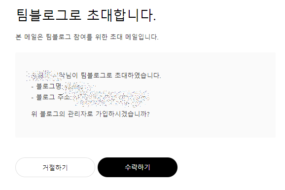 지금 티스토리 로그인 한 계정이 aaa.naver.com 이다 여기에 있는 블로그를 bbb.naver.com 계정에서 관리를 하기 위해서는 이렇게 팀블로그 에서 초대하기를 bbb.tistory.com 으로 보내면 된다는 이야기 이다.