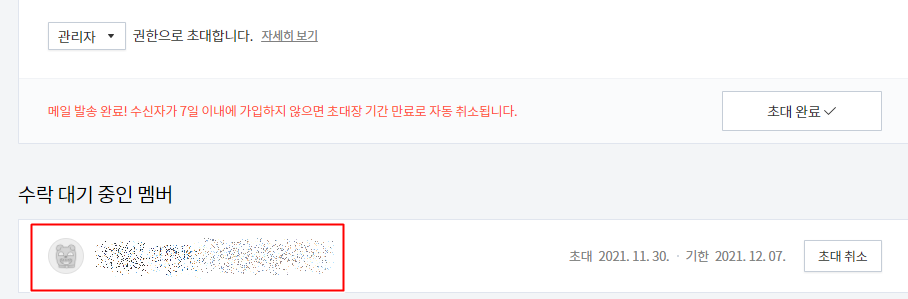 초대 보내기를 하면 아래와 같이 초대 완료로 들어가게 된다 그러면 보낸 메일보기를 하면 메일이 와 있는 걸 알 수가 있다 그러니 개념을 이야기 한번 더 하자면