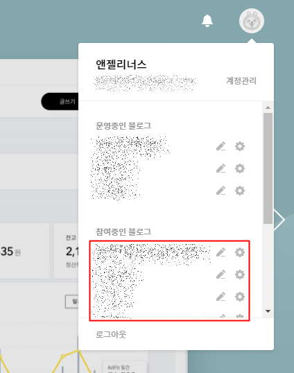 이렇게 참여중인 블로그를 볼 수가 있다 운영중인 블로그와 팀블로그로 참여를 한 블로그가 다 나오게 되는 것이다 이렇게 하면 한번 로그인으로 다른 계정의 블로그 까지 모두가 다 관리를 할 수가 있다