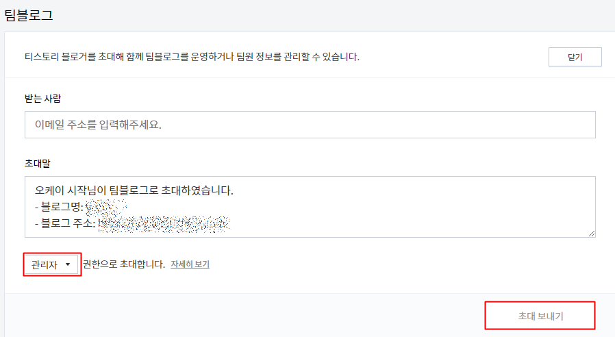 초대는 편집자, 관리자 등의 권한을 줄 수가 있다 편집자 권한은 글만 작성을 할 수가 있고 관리자는 설정을 다 바꿀 수가 있다 그러니 이 부분은 판단을 해서 처리를 하면 될 것 같다