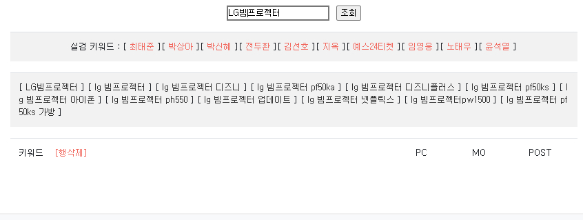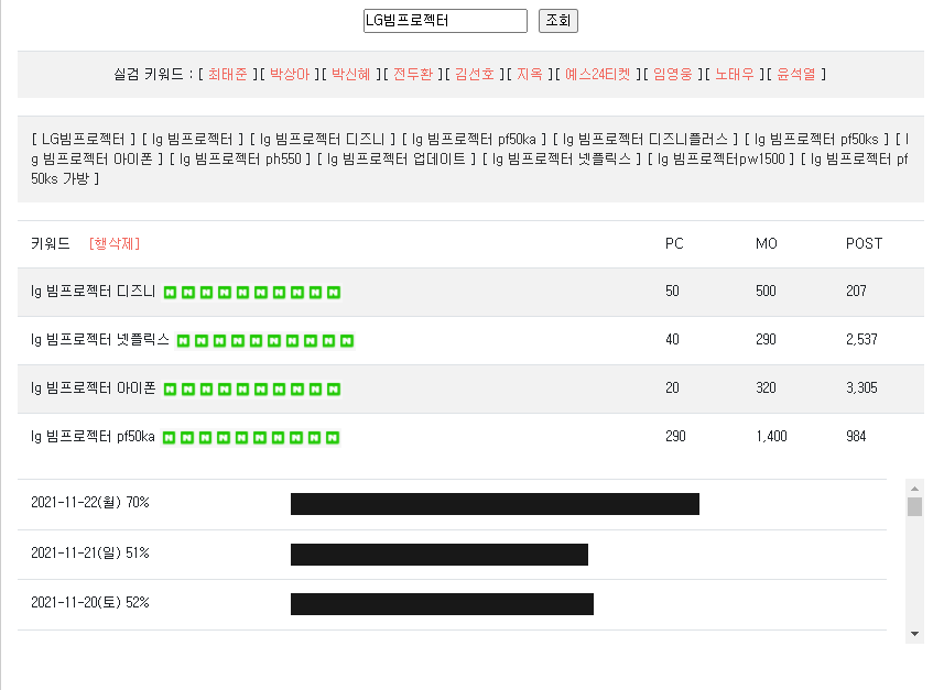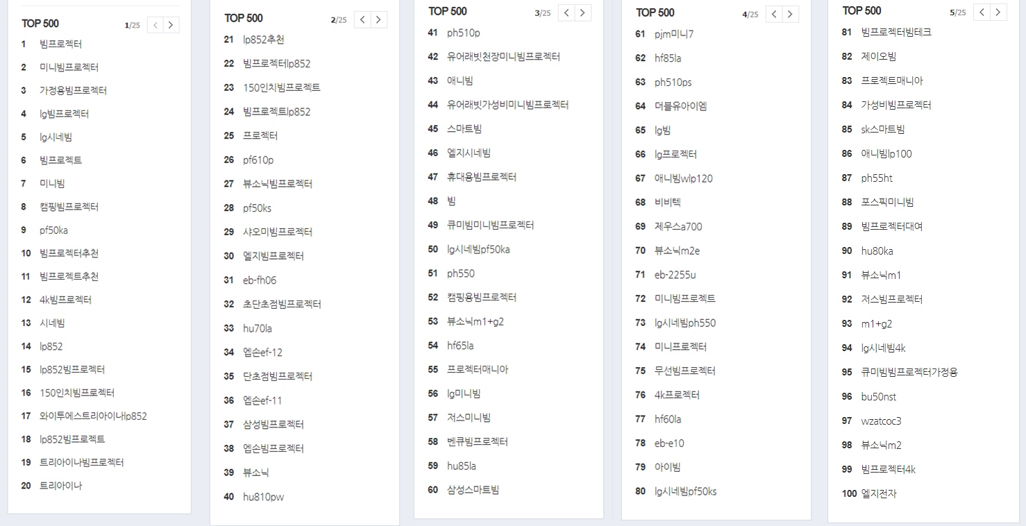 그때 LG빔프로젝터가 상당히 인기가 많은 것 같아서 키워드를 넣고 한번 조회를 해 보겠다 그러면 아래에 세부 키워드가 상당히 많이 나오는 걸 알 수가 있다 그러면 어떤 키워드를 쿠팡 파트너스의 상품과 접목을 시킬지를 한번 생각을 해 본다